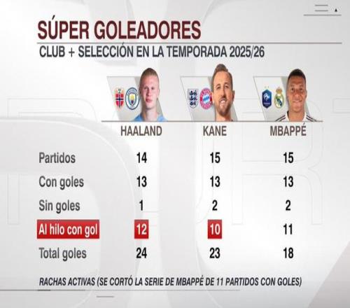 欧冠联赛阶段第三轮,哈兰德和凯恩都斩获进球,哈兰德在俱乐部和国家队已经连续12场比赛取得进球,凯恩则是连续10场俱乐部和英格兰队比赛破门。