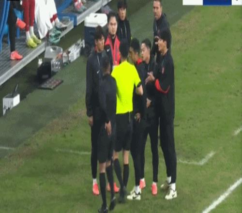 从慢镜头来看,费利佩头球之后,球击中了周缘德手臂。最终,视频助理裁判确认进球无效,主裁判艾堃向周缘德出示黄牌。蓉城教练组在场边激烈抗议,艾堃跑到边线向助教出示黄牌,并且向徐正源解释,但蓉城主帅情绪激动。