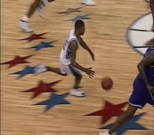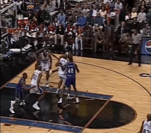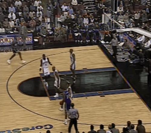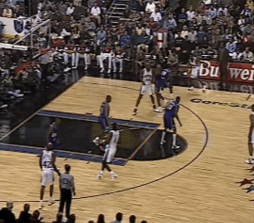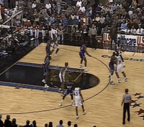 两幕插曲或许点燃了他的斗志:先是同届选秀的5号秀雷-阿伦在他头上投进了生涯首分,“君子雷”在转换中找到了艾弗森,一记突破后的背后运球把他晃了个趔趄,然后稳稳投进了大空位中投;紧接着,杰里-斯塔克豪斯很快还以颜色,他接球后以迅雷之势摆脱阿伦,上演了一次十佳球级别的反身扣篮。