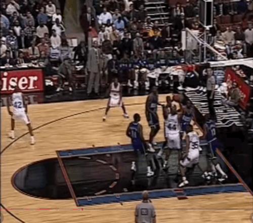 艾弗森并未等待太久,属于他的时刻随即到来。他在右翼45度面对希尔曼-道格拉斯,用一次幅度超大的体前变向把这位7年老将过了个干净,面对安德鲁-朗和文-贝克的围追堵截没有丝毫犹豫,直接起飞尝试把球摁进篮筐。虽然球没能直接扣进,但裁判响哨——雄鹿干扰球违例,艾弗森拿下生涯首分!
