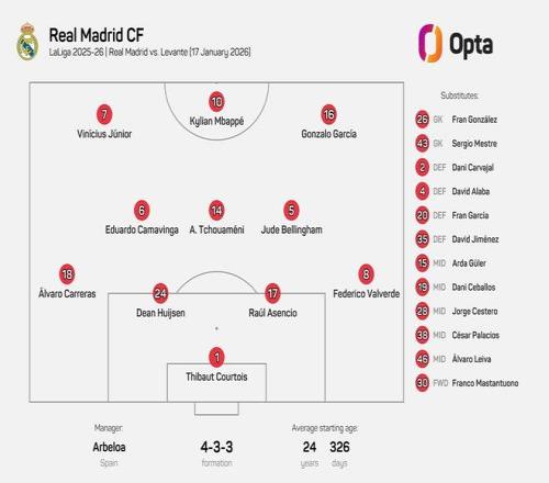皇家马德里首发:1-库尔图瓦、8-巴尔韦德、17-劳尔-阿森西奥、24-赫伊森、18-阿尔瓦罗-卡雷拉斯、14-楚阿梅尼、6-卡马文加、5-贝林厄姆、7-维尼修斯、16-贡萨洛-加西亚、10-姆巴佩